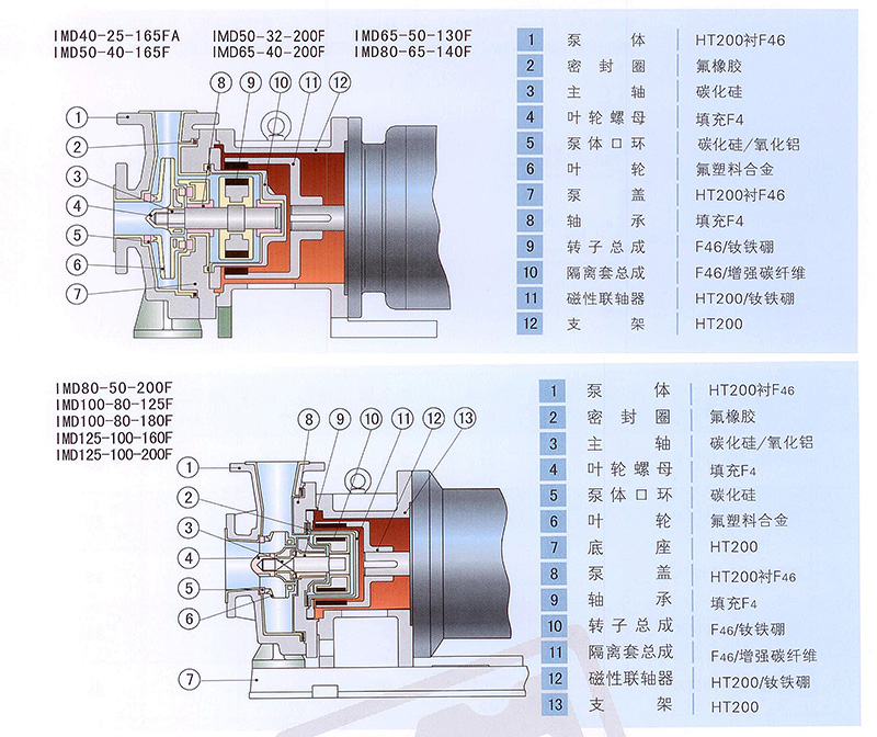 IMD系列磁力泵,流量:1~160m3/h;楊程17~62m,適用于輸送強(qiáng)腐蝕,易燃、易爆、有毒、易揮發(fā)的化學(xué)介質(zhì)。