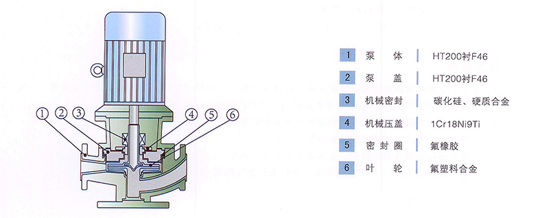 1、GF系列氟塑料管道泵為立式結(jié)構(gòu),進出口口徑相同,且位于同一中心線上;