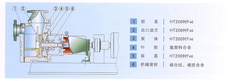 過流部件采用氟塑料、氟塑料合金制造,耐腐蝕性能優(yōu)異。基體采用金屬制造,耐壓能力強(qiáng)。